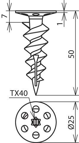 Kołki do sztywnych płyt piankowych do mocowania uchwytów przewodów, płaskowników i wsporników do iglic w złożonych zewnętrznych systemach izolacji termicznej ETICS. Z gniazdem sześciokątnym (TX40) i montaż za pomocą wkrętów do drewna Ø4,5 mm. Wykonanie krótkie.
