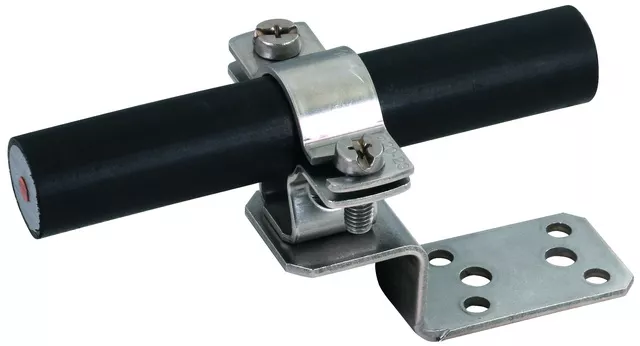 Wspornik dachowy z dwuśrubową płytką dociskową i końcówką przyłączeniową Z-kształtną ze stali nierdzewnej do układania przewodu HVI na metalowych dachach z okrągłym rąbkiem stojącym.