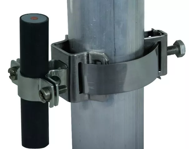 Wspornik do przewodu z taśmą mocującą, do mocowania przewodu HVI (czarny) lub HVI light np. na rurach. Wykonanie ze wspornikiem do przewodu z metalu.