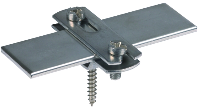 Wsporniki do płaskownika z płytką dociskową ze szczeliną (wykonanie płaskie), do mocowania płaskowników. Wykonanie ze szczeliną (6,5 x 16 mm), wstępnie zmontowany z wkrętem do drewna.