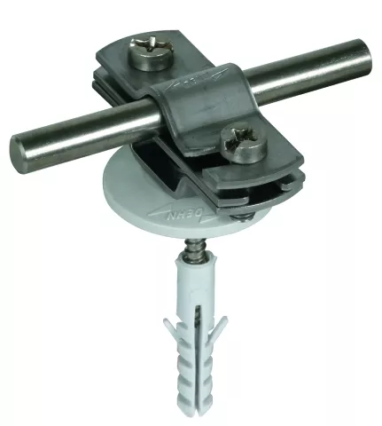Wsporniki z dwuśrubową płytką dociskową ze szczeliną (wykonanie płaskie), do układania drutów i płaskowników. Wykonanie wstępnie zmontowane z wkrętem do drewna, z podkładką z tworzywa sztucznego (kolor szary) i kołkiem rozporowym.