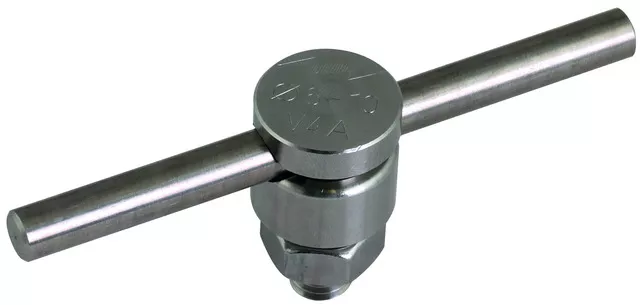 Łączniki KS zgodne z normą DIN EN 62561-1, do obciążalnego prądem piorunowym podłączania drutów okrągłych, np. do profili płaskich, obejm do rur spustowych lub innych elementów instalacji odgromowej. Wykonanie jednoczęściowe, stal nierdzewna (V4A), ze śrubą i nakrętką M10.