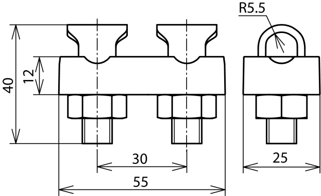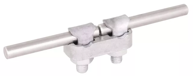 Łączniki KS zgodne z normą DIN EN 62561-1, do obciążalnego prądem piorunowym podłączania drutów okrągłych. Wykonanie dwuczęściowe jak łącznik, odległość 30 mm, ze śrubą i nakrętką M10.