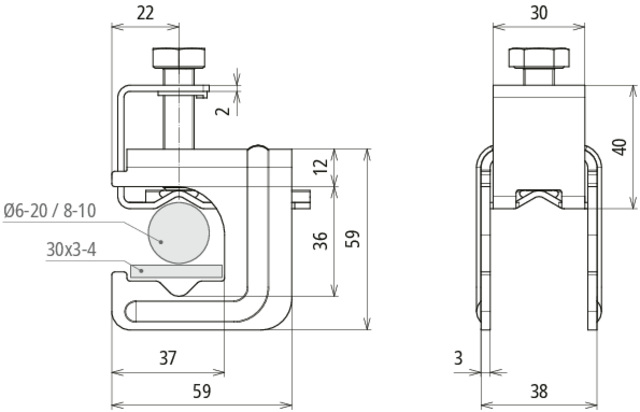 Zacisk kabłąkowy do zbrojenia z klamrą dociskową, do drutu o śr. 6-20 / 8-10 mm, drutu o śr. 6-20 mm / płaskownika o szer. 30 mm lub dwóch płaskowników o szer. 30x3-4 mm, z pierścieniem, stal niepokryta VK DB KR 6.20 8.10 FL30 BSB STBL