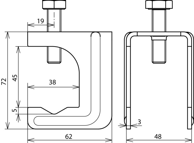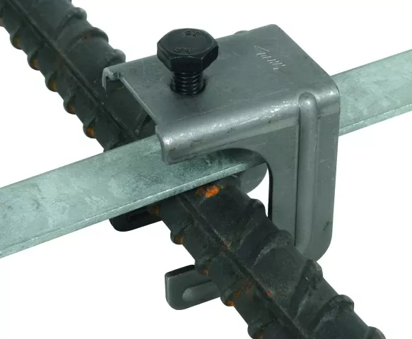 Zacisk łączący MAXI bez klamry dociskowej spełniający wymagania normy DIN EN 62561-1, do łączenia drutów okrągłych i płaskowników w fundamentach betonowych lub stalowych siatek zbrojeniowych i prętów zbrojeniowych z drutami okrągłymi i płaskownikami. Wykonanie do połączeń krzyżowych.