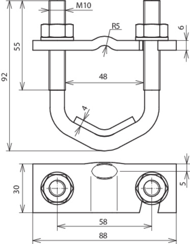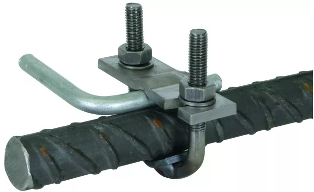 Zacisk kabłąkowy spełniający wymagania normy DIN EN 62561-1, do łączenia prętów zbrojeniowych z drutami okrągłymi i płaskownikami. Wykonanie do dużych średnic, Ø16-48 mm.