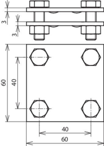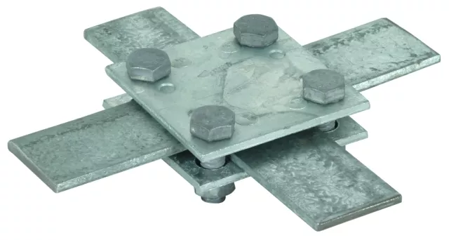 Zacisk krzyżowy spełniający wymagania normy DIN EN 62561-1, do połączeń naziemnych i podziemnych do dwóch płaskowników. Wykonanie bez płytki pośredniej ze śrubami M8.