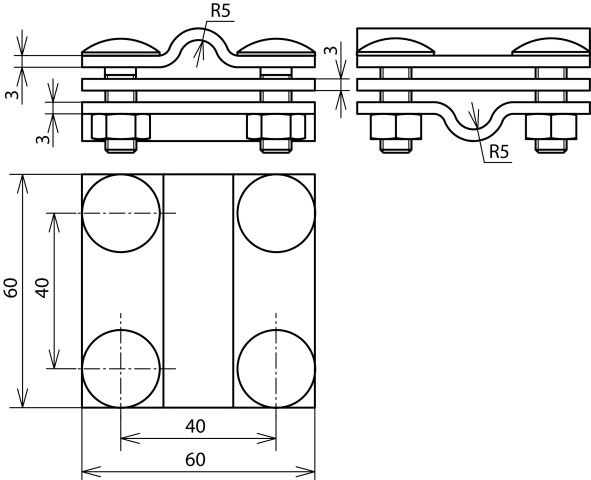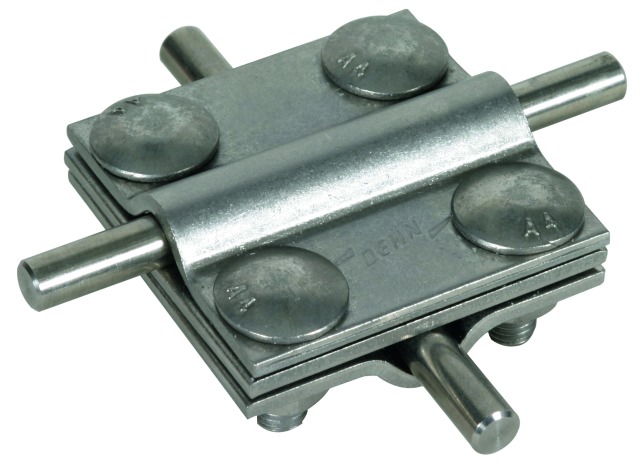 Zacisk krzyżowy spełniający wymagania normy DIN EN 62561-1, do połączeń naziemnych i podziemnych płaskowników i drutów okrągłych. Wykonanie z płytką pośrednią i śrubami M8.