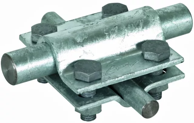 Zacisk krzyżowy spełniający wymagania normy DIN EN 62561-1, do połączeń naziemnych i podziemnych płaskowników i drutów okrągłych z iglicą odgromową / prętem uziemiającym. Wykonanie bez płytki pośredniej ze śrubami M8.