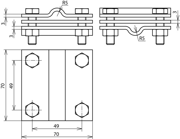 Zacisk krzyżowy spełniający wymagania normy DIN EN 62561-1, do połączeń naziemnych i podziemnych drutów okrągłych i płaskowników (szerokość do 40 mm). Wykonanie z płytką pośrednią i śrubami M8.