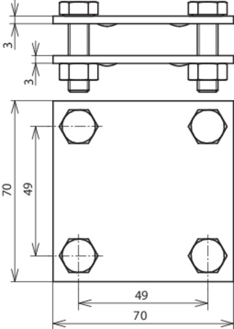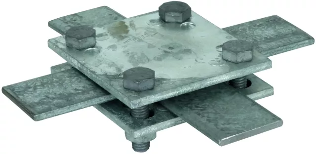 Zacisk krzyżowy spełniający wymagania normy DIN EN 62561-1, do połączeń naziemnych i podziemnych do dwóch płaskowników (szerokość do 40 mm). Wykonanie bez płytki pośredniej ze śrubami M8.
