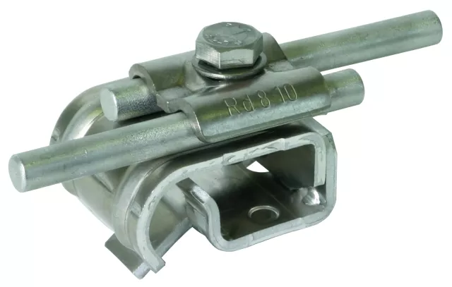 Zacisk rynnowy spełniający wymagania normy DIN EN 62561-1, do łączenia drutów z rąbkiem rynny dachowej. Wykonanie z podwójną płytką dociskową, prowadzenie przewodu wzdłużne lub poprzeczne.