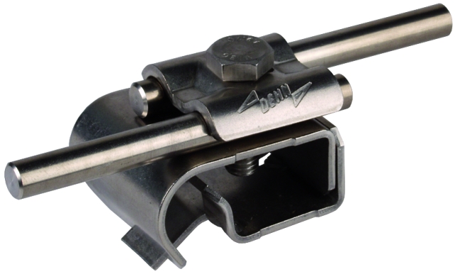 Zacisk rynnowy spełniający wymagania normy DIN EN 62561-1, do łączenia drutów z rąbkiem rynny dachowej. Wykonanie z podwójną płytką dociskową, prowadzenie przewodu wzdłużne lub poprzeczne.