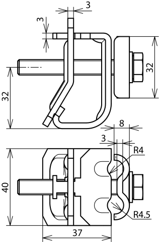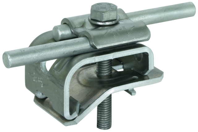 Zacisk rynnowy spełniający wymagania normy DIN EN 62561-1, do łączenia drutów z rąbkiem rynny dachowej. Wykonanie z pojedynczą śrubą z podwójną płytką dociskową, prowadzenie przewodu wzdłużne.