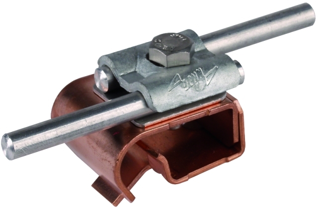 Zacisk rynnowy spełniający wymagania normy DIN EN 62561-1, do łączenia drutów z rąbkiem rynny dachowej. Wykonanie bimetaliczne, do rynien miedzianych, z podwójną płytką dociskową (stal ocynkowana ogniowo) i płytką pośrednią.