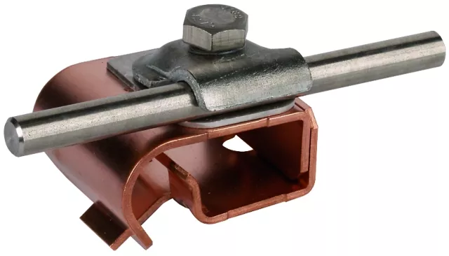 Zacisk rynnowy spełniający wymagania normy DIN EN 62561-1, do łączenia drutów z rąbkiem rynny dachowej. Wykonanie bimetaliczne, do rynien miedzianych, z ramą zaciskową (stal ocynkowana ogniowo) i płytką pośrednią