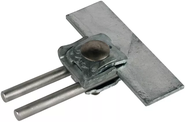 Zacisk krawędziowy spełniający wymagania normy DIN EN 62561-1, do łączenia drutów okrągłych z rąbkami. Wykonanie z podwójną płytką dociskową, prowadzenie przewodu wzdłużne lub poprzeczne.