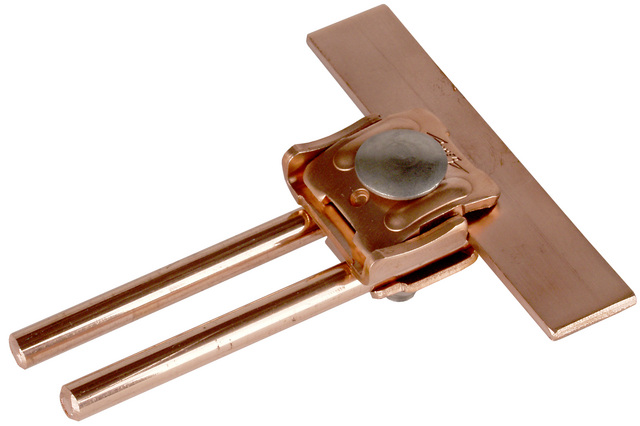 Zacisk krawędziowy spełniający wymagania normy DIN EN 62561-1, do łączenia drutów okrągłych z rąbkami. Wykonanie z podwójną płytką dociskową, prowadzenie przewodu wzdłużne lub poprzeczne.