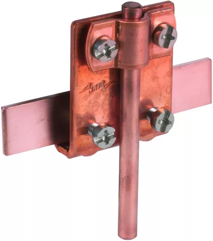 Zacisk krawędziowy spełniający wymagania normy DIN EN 62561-1, do łączenia drutów okrągłych z rąbkami. Wykonanie z dwuśrubową płytką dociskową, do mocowania na rąbku, prowadzenie przewodu wzdłużne lub poprzeczne.