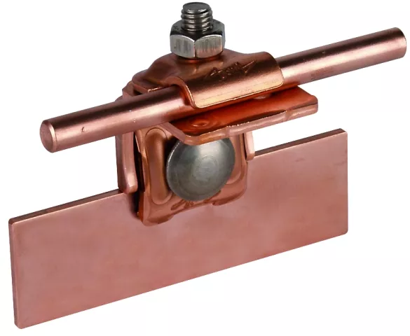 Zacisk krawędziowy z większą powierzchnią styku spełniający wymagania normy DIN EN 62561-1, do łączenia drutów okrągłych z rąbkami. Wykonanie kątowe, połączenie wzdłużne lub poprzeczne.