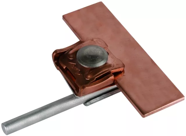 Zacisk krawędziowy spełniający wymagania normy DIN EN 62561-1, do łączenia drutów okrągłych z rąbkami. Wykonanie bimetaliczne, do rąbków miedzianych, z kupalową płytką pośrednią, prowadzenie przewodu wzdłużne lub poprzeczne.