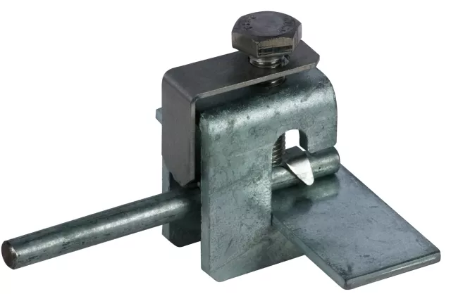 Zacisk przyłączeniowy z elementem dociskowym spełniający wymagania normy DIN EN 62561-1, do przyłączania do konstrukcji stalowych i blach stalowych, z pojedynczą śrubą. Wykonanie małe, połączenie wzdłużne lub poprzeczne.