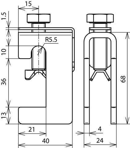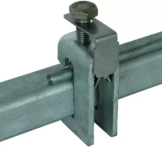 Zacisk przyłączeniowy z elementem dociskowym spełniający wymagania normy DIN EN 62561-1, do przyłączania do konstrukcji stalowych i blach stalowych, z pojedynczą śrubą. Wykonanie duże, połączenie wzdłużne lub poprzeczne.