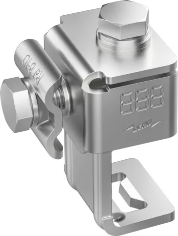 Zacisk przyłączeniowy z ostrzem do dźwigarów stalowych spełniający wymagania normy DIN EN 62561-1, do podłączania do konstrukcji stalowych. Wykonanie z podwójną płytką dociskową.
