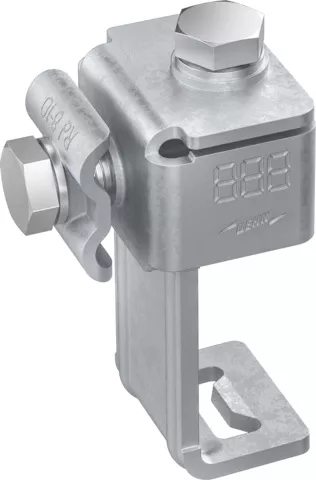 Zacisk przyłączeniowy z ostrzem do dźwigarów stalowych spełniający wymagania normy DIN EN 62561-1, do podłączania do konstrukcji stalowych. Wykonanie z podwójną płytką dociskową.