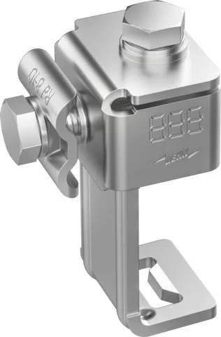 Zacisk przyłączeniowy z ostrzem do dźwigarów stalowych spełniający wymagania normy DIN EN 62561-1, do podłączania do konstrukcji stalowych. Wykonanie z podwójną płytką dociskową.