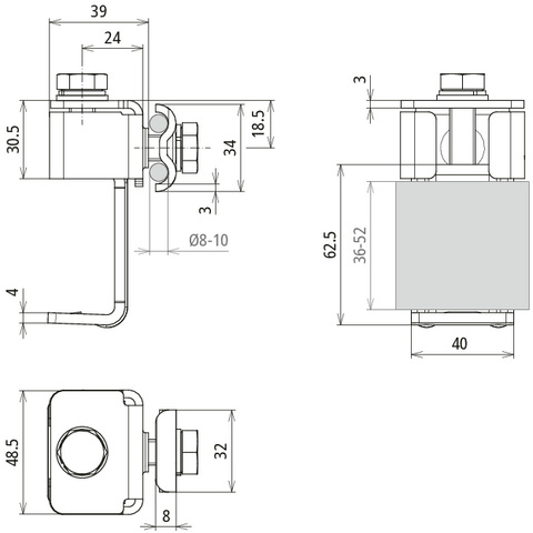 Zacisk przyłączeniowy do dźwigarów stalowych, zakres zacisku 36-50 mm, z podwójnym zaciskiem, stal nierdzewna AKK DUL 8.10 KBF 36 52 V2A