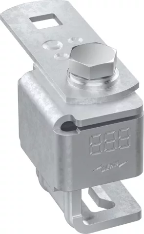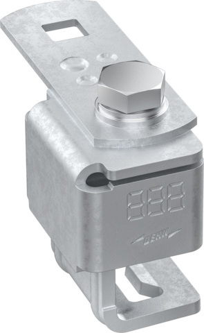 Zacisk przyłączeniowy z ostrzem do dźwigarów stalowych spełniający wymagania normy DIN EN 62561-1, do podłączania do konstrukcji stalowych. Wykonanie z końcówką przyłączeniową.