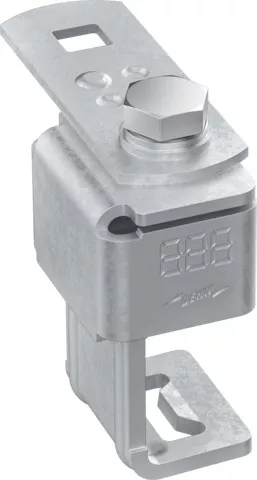 Zacisk przyłączeniowy z ostrzem do dźwigarów stalowych spełniający wymagania normy DIN EN 62561-1, do podłączania do konstrukcji stalowych. Wykonanie z końcówką przyłączeniową.