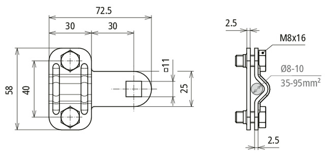 Zacisk przyłączeniowy płaskownika (30x4) / drutu (8-10 mm) z otworem kwadratowym o śr. 11 mm, stal nierdzewna KS B11.11 8.10 V2A