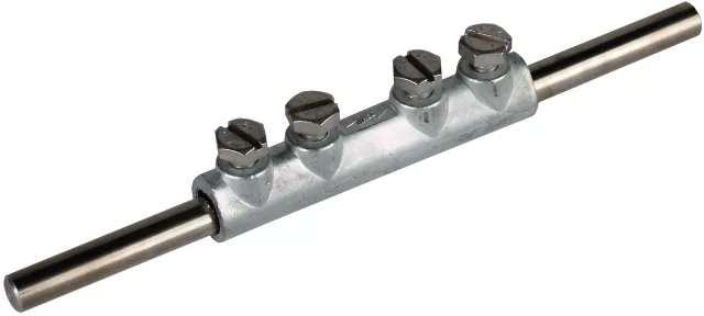 Mufy łączące zgodne z normą DIN EN 62561-1, do łączenia dwóch drutów okrągłych w układzie wzdłużnym za pomocą czterech śrub M6. Wykonanie z ciśnieniowego odlewu cynkowego 8.
