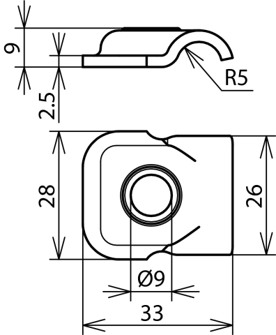 Wspornik, rama zaciskowa do układania drutów okrągłych np. podtynkowo lub na ścianie (pod zewnętrznym systemem izolacji termicznej). Wykonanie z otworem 9 mm.