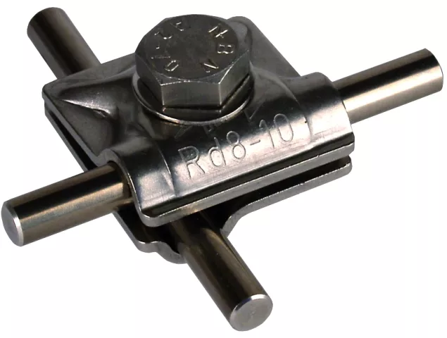 Zacisk połączeniowy spełniający wymagania normy DIN EN 62561-1, do uniwersalnego stosowania jako zacisk krzyżowy, T-kształtny i równoległy do drutów okrągłych. Wykonanie dwuczęściowe ze śrubą z łbem sześciokątnym, podkładką sprężystą i gwintem w podstawie.