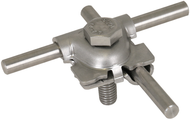 Zacisk uniwersalny połączeniowy z zabezpieczeniem przed obracaniem zgodnie z DIN EN 62561-1, do uniwersalnego stosowania jako zacisk krzyżowy, T-kształtny i równoległy do drutów okrągłych. Wykonanie dwuczęściowe ze śrubą z łbem sześciokątnym i gwintem w podstawie.