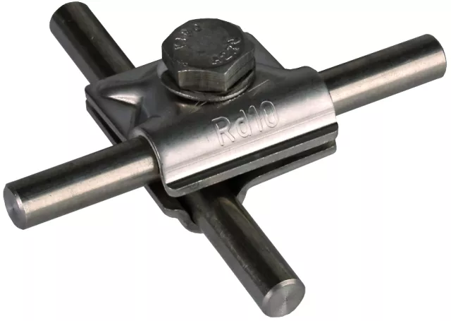 Zacisk połączeniowy spełniający wymagania normy DIN EN 62561-1, do uniwersalnego stosowania jako zacisk krzyżowy, T-kształtny i równoległy do drutów okrągłych. Wykonanie dwuczęściowe ze śrubą z łbem sześciokątnym, podkładką sprężystą i gwintem w podstawie.