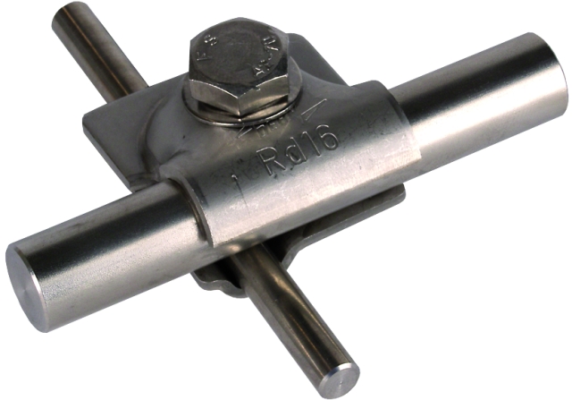 Zacisk połączeniowy spełniający wymagania normy DIN EN 62561-1, do uniwersalnego stosowania jako zacisk krzyżowy, T-kształtny i równoległy do drutów okrągłych na iglicach odgromowych. Wykonanie dwuczęściowe ze śrubą z łbem sześciokątnym, podkładką sprężystą i gwintem w podstawie.