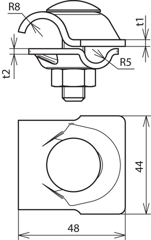 Zacisk połączeniowy spełniający wymagania normy DIN EN 62561-1, do uniwersalnego stosowania jako zacisk krzyżowy, T-kształtny i równoległy do drutów okrągłych na iglicach odgromowych. Wykonanie dwuczęściowe ze śrubą z łbem grzybkowym i z zabezpieczeniem przed obracaniem.