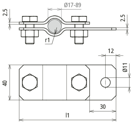 Obejma taśmowa uziemiająca, urządzenie piorunochronne spełniające wymagania normy DIN EN 62561-1, do integracji rur z ochronnym i funkcjonalnym połączeniem wyrównawczym zgodnie z DIN VDE 0100-410/540 i połączeniem wyrównawczym piorunochronnym spełniającym wymagania normy DIN EN 62305-3 (VDE 0185-305-3). Wykonanie ze stali nierdzewnej ze śrubami M10, przyłącze na płaskowniki za pomocą śrub i nakrętek M10, na drut okrągły 7-10 mm np. za pomocą łącznika KS.