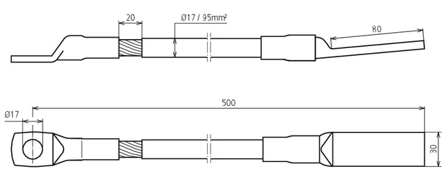 Łącznik uziemiający z przewodu miedzianego NYY-O o śr. 17 mm do uziemiania dużych rur, z końcówką kablową 80x30 mm D BEB 40 / EBS 15-03-25
