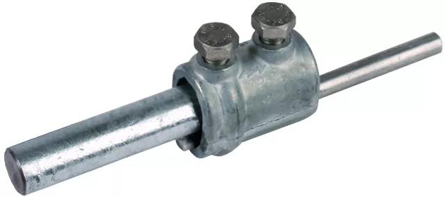 Mufa rozłączna zgodna z normą DIN EN 62561-1, do łączenia przewodów odprowadzających z prętami uziemiającymi. Wykonanie zamknięte, do prętów uziemiających z drutu okrągłego 16 mm.