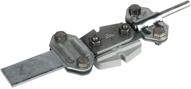 Złącze pobiercze spełniające wymagania normy DIN EN 62561-1, z elementem izolacyjnym i końcówką rozłączającą. Wykonanie do drutu i płaskownika.