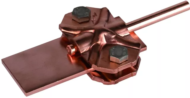 Zacisk łącząco-rozłączający spełniający wymagania normy DIN EN 62561-1, do łączenia przewodów odprowadzających z prętami uziemiającymi. Wykonanie dwuczęściowe, do drutów okrągłych i płaskowników (szerokość do 40 mm).