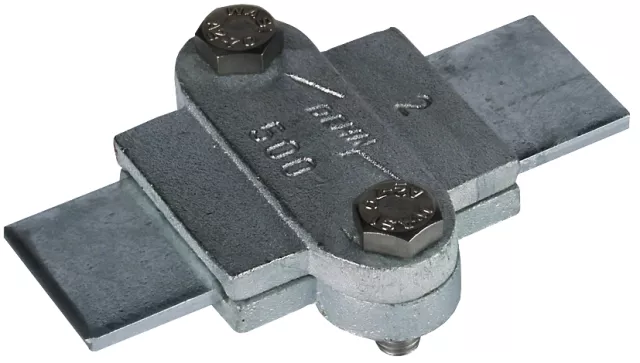 Zacisk łącząco-rozłączający spełniający wymagania normy DIN EN 62561-1, do łączenia przewodów odprowadzających z prętami uziemiającymi. Wykonanie dwuczęściowe, do dwóch płaskowników (szerokość do 30 mm).