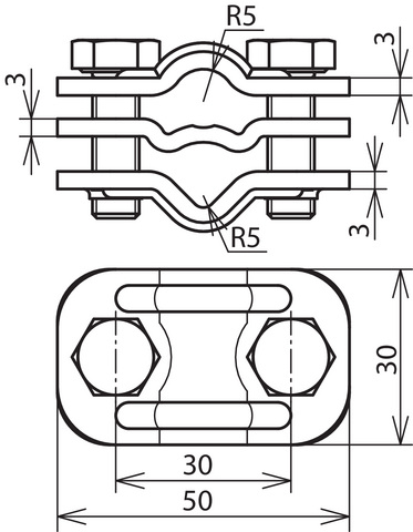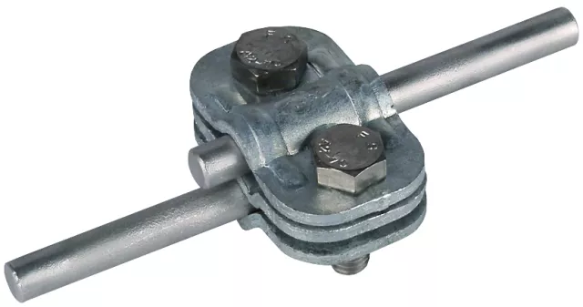 Zacisk rozłączny UNI spełniający wymagania normy DIN EN 62561-1, do łączenia przewodów odprowadzających z prętem uziemiającym. Wykonanie z płytką pośrednią do dwóch drutów, wykonanie małe.