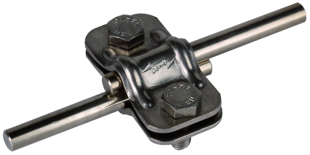 Zacisk rozłączny UNI spełniający wymagania normy DIN EN 62561-1, do łączenia przewodów odprowadzających z prętem uziemiającym. Wykonanie bez płytki pośredniej do dwóch drutów.