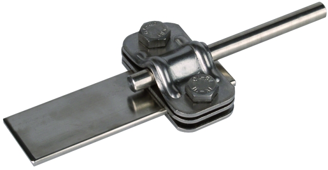 Zacisk rozłączny UNI spełniający wymagania normy DIN EN 62561-1, do łączenia przewodów odprowadzających z prętem uziemiającym. Wykonanie z płytką pośrednią, do drutów okrągłych i płaskowników.